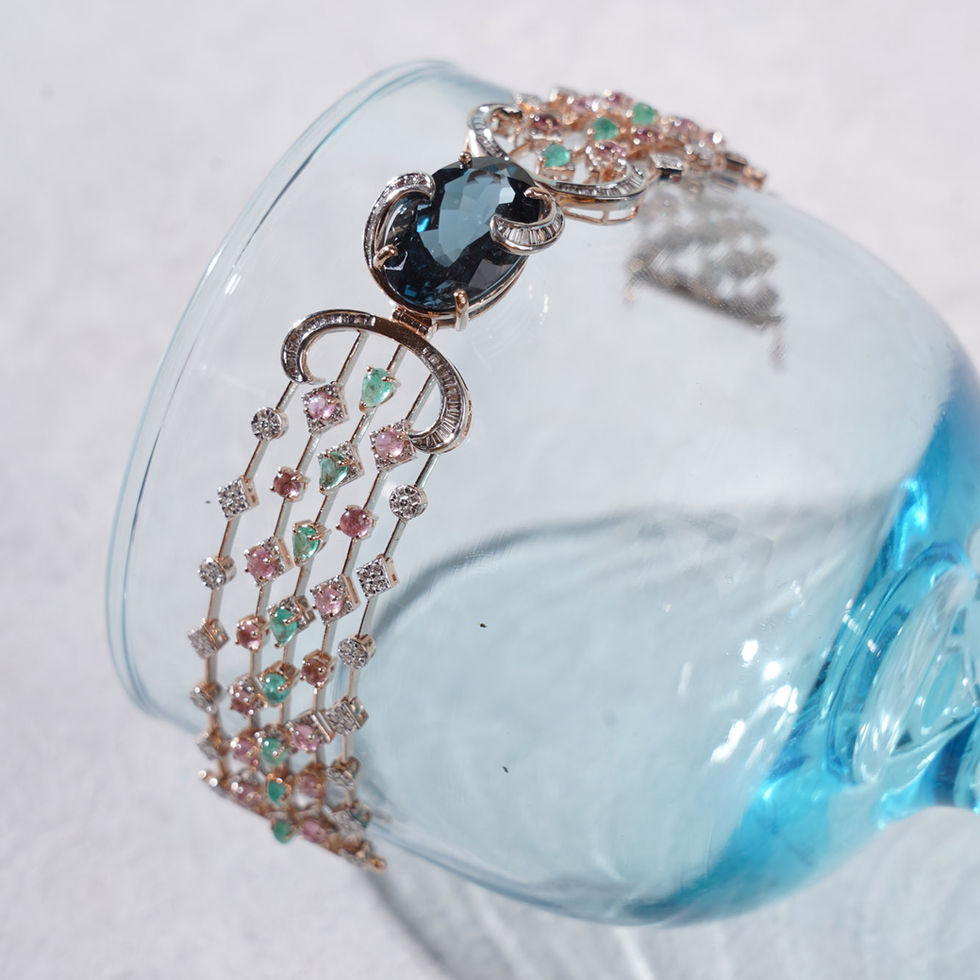 Couture bracelet studded with a one of its kind London Blue Topaz, Emeralds and Tourmalines